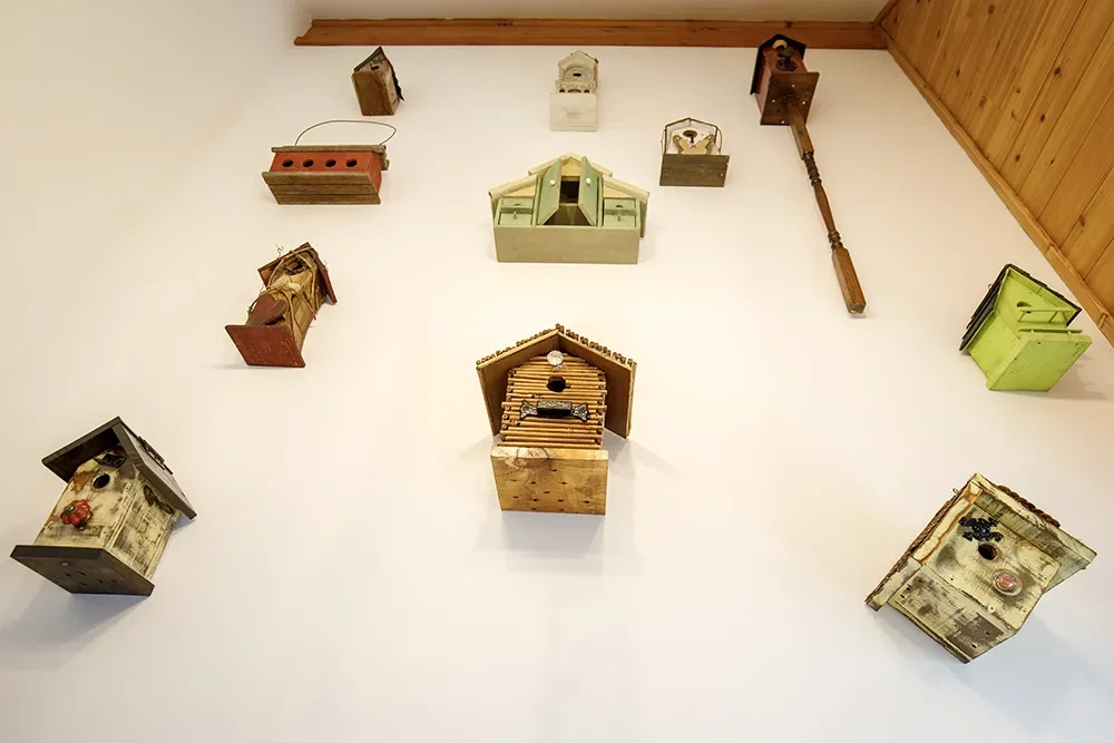 The Nest is a cute room with great personality! A double-size wrought-iron bed, chandelier and a cool wall-art installation of birdhouses grace this room. A tall cedar wall frames the east-facing window with pull-down shades. The roomy bathroom, shared with The Coop room, is just steps away. It features classic black-and-white tiling and a four-piece bath.